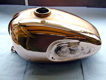 Motorradtank - Kniekissen abgebohrt, ausgebeult, geschliffen und im Kupfer poliert als optimale Vorbereitung für die weiteren Arbeitsgänge zur Verchromung.